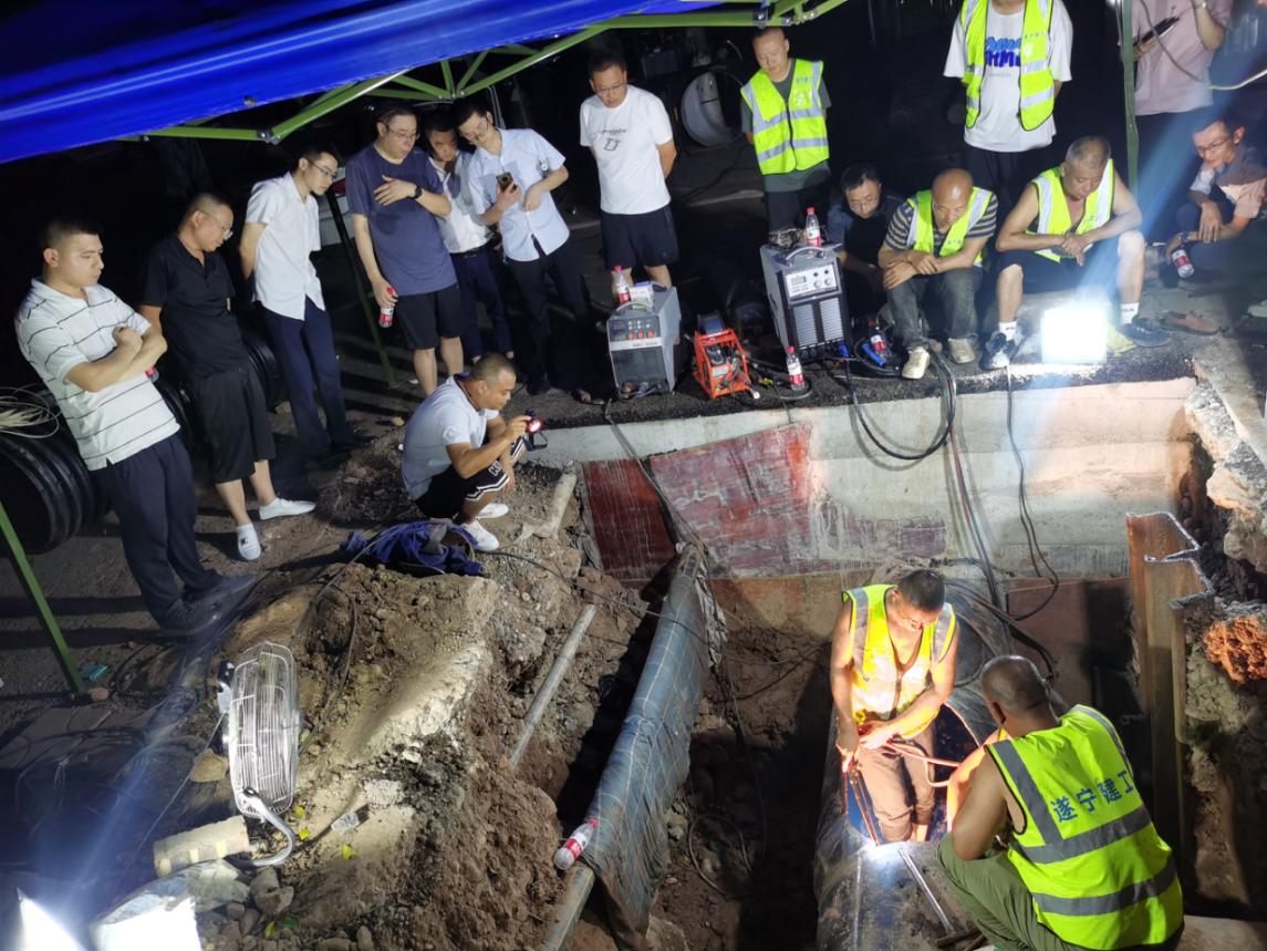 7月16日凌晨零点,随着明星滨河水厂闭阀停水,凤台水厂与滨河水厂碰管的“零点行动”正式打响。施工人员有条不紊细心操作,督导人员紧盯每一个步骤确保万无一失,辅助后勤人员全力做好保障工作,火星四射,挥汗如雨,共同谱写出一首夏夜劳动进行曲。