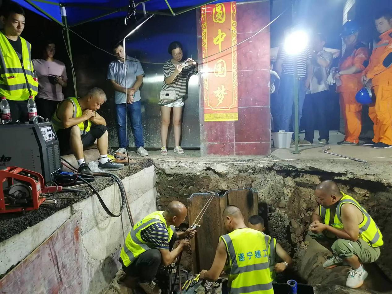 7月16日凌晨零点,随着明星滨河水厂闭阀停水,碰管正式开始。首先要对凤台水厂供水管与滨河水厂出水管连接处进行切割贯通,由于管内余水一直未能排空,水中作业影响了施工进度。但是,明星自来水公司计划的停水时间只有7个小时,时间宝贵容不得丝毫耽搁,施工人员蹲坐在直径只有80厘米的管道中,克服环境影响,专注每一道工序,在现场督导人员的科学指挥和相关人员的密切配合下,于凌晨五点顺利完成碰管任务。