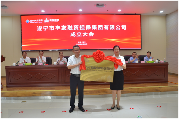 8月24日,遂宁市丰发融资担保集团有限公司成立大会圆满举行。市政府副秘书长徐勇、遂宁兴业集团董事长向诚分别为市丰发担保集团授牌、授印。市国资委主任陈学宣读了《市国资委关于组建遂宁市丰发融资担保集团有限公司的批复》以及公司主要负责同志职务任免文件。