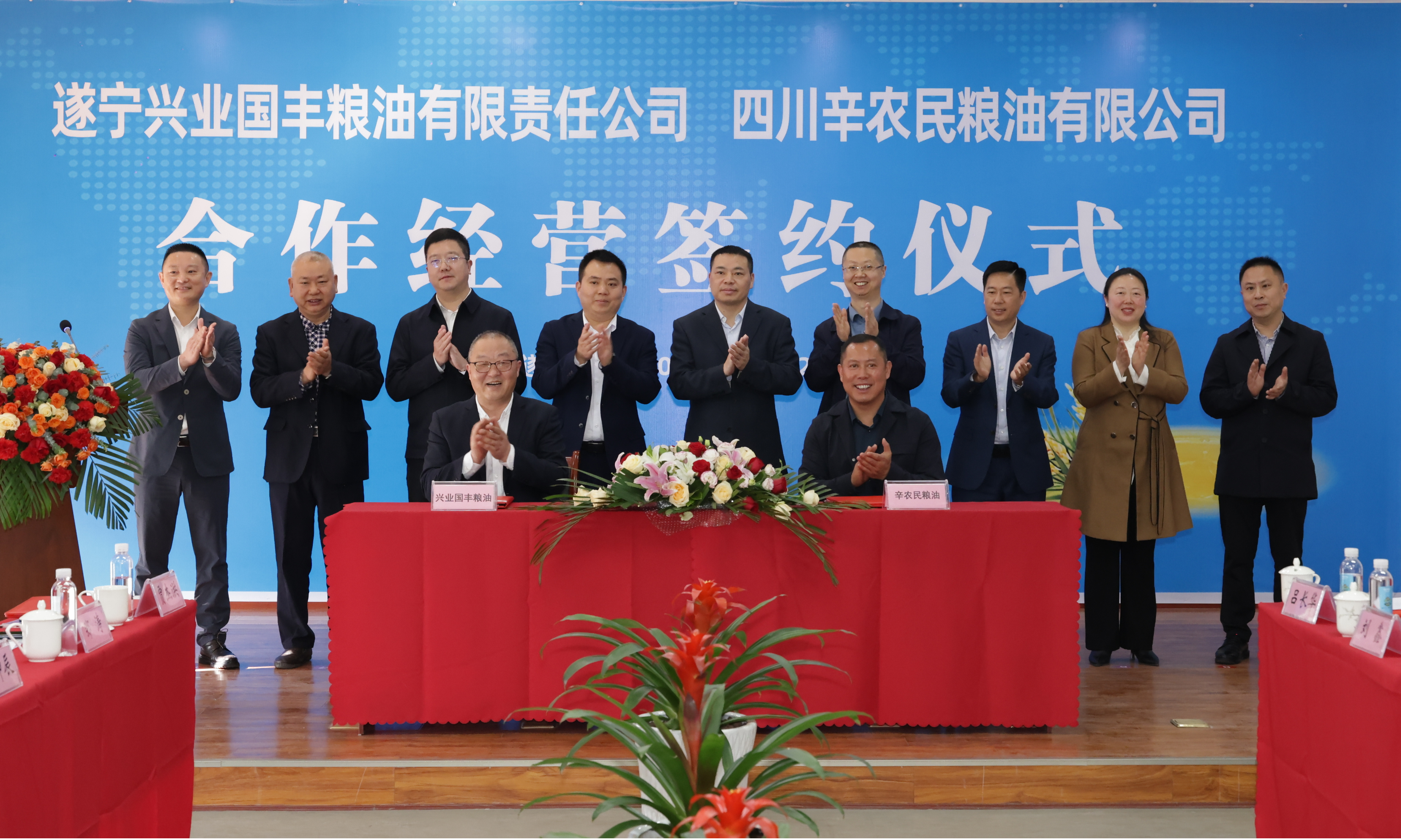3月28日,兴业集团直属企业国丰粮油公司与四川辛农民粮油公司合作经营签约仪式圆满举行。市政府副秘书长康合军,市国资委党委书记杨雷,以及各县(市、区)农业企业、在遂大型商超、供应商、经销商代表共同见证签约。仪式由兴业集团党委书记、董事长向诚主持。