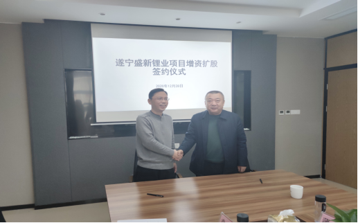 2020年12月28日下午,工投公司执行董事兼遂宁鼎泰基金管理公司董事长米健代表遂宁市盛新锂电股权投资中心与盛新锂业公司董事长兼总经理姚开林在射洪经开区锂电产业园成功签署《遂宁盛新锂业项目增资扩股》等相关协议,标志着我市正式拉开了锂电基金投资锂电产业的序幕。