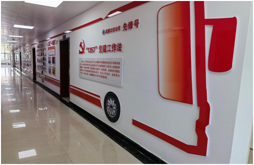 党建文化墙由“红色引领、绿色发展、蓝色护航”三色主题构成。“红色引领”包括党的政治建设、习近平新时代中国特色社会主义思想、习近平总书记关于国企党建工作重要讲话精神以及公司“1357”党建工作法等内容;“绿色发展”包括习近平总书记在第二届联合国可持续交通大会开幕式上重要讲话精神以及公司发展理念、公司简介等内容;“蓝色护航”包括中国共产党廉洁自律准则、党的六大纪律和中华优秀传统文化等内容。