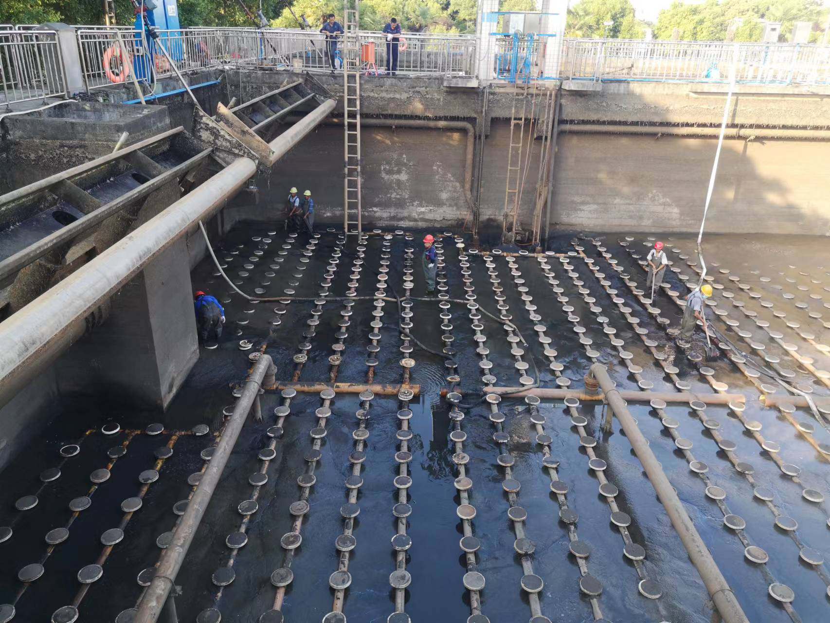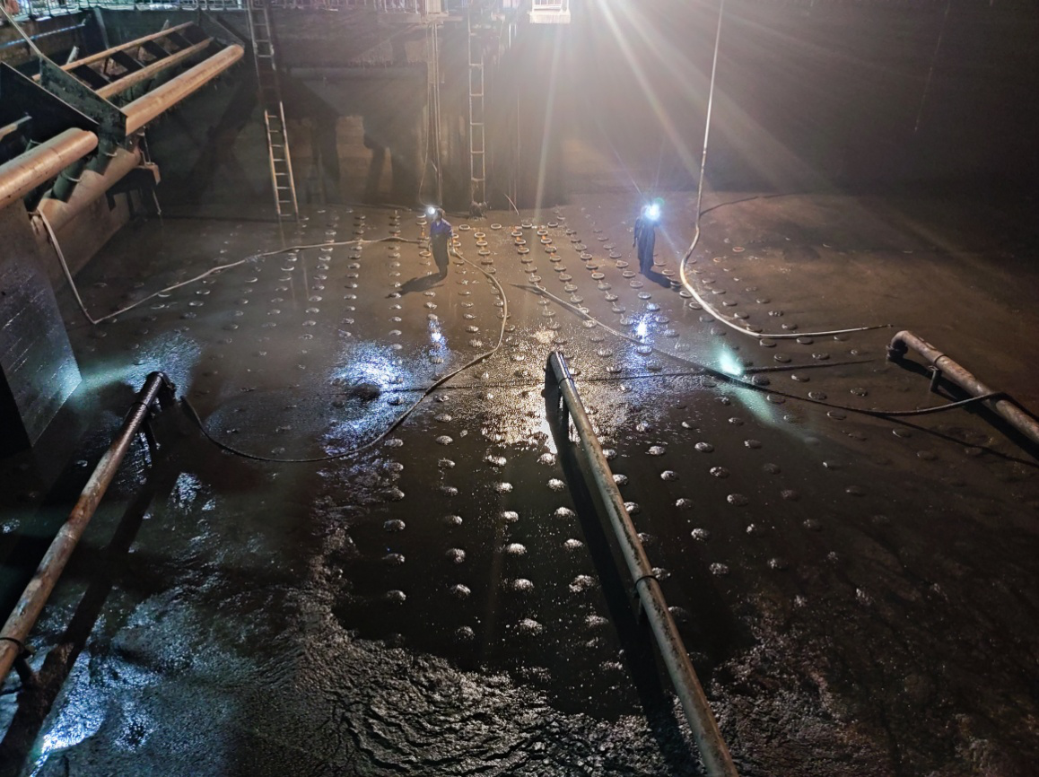 高温“烤”验,暑气逼人。城南第一污水处理厂CASS生化处理池曝气管因年久老化和连日高温发生膨胀,造成接口脱落。为及时排除设备故障,确保工艺系统运行稳定、出水达标排放,发展水务公司排水事业部在制定周密的抢修方案后,于7月6日至8日,通过连续3天的奋战,顺利完成该厂曝气系统检修。