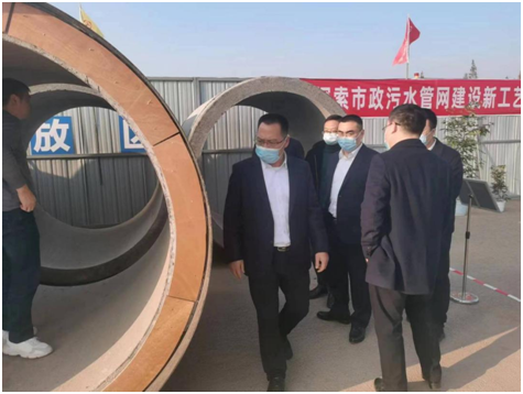 杜海洋一行实地了解项目试验段推进情况,现场参观DN1800预制混凝土管。据悉,项目顶管段污水管道采用的是Ⅲ级钢筋混凝土管,混凝土强度等级为C50,抗渗等级不低于P8,标准管节长度2.0m。管道接口为柔性接头A型钢承口型式,设橡胶止水圈,橡胶圈采用遇水膨胀橡胶,橡胶在吸收水分后体积会膨胀1~3倍,保证了管道的水密性。杜海洋现场强调一定要强化质量管理,确保工程质量,打造精品工程、安全工程。