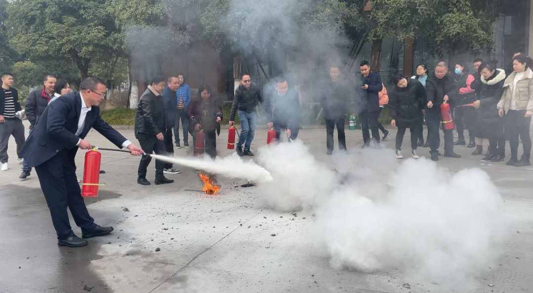 灭火实操——遂宁发展城建集团领导带头组织员工进行灭火器使用演练。