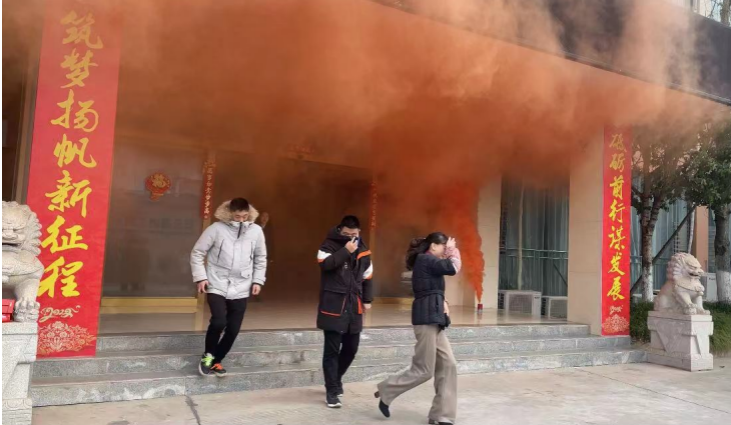 逃生演练——伴随着呼啸的警报声,全体员工捂住口鼻井然有序地从办公楼两侧通道及时撤离至空地。
