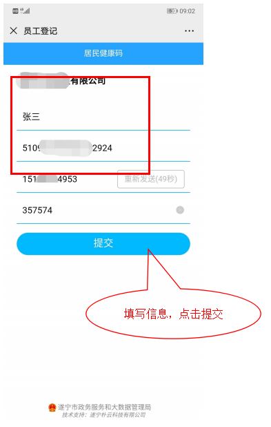 员工使用手机微信扫描单位发放的注册二维码,进入员工登记页面,在登记页面输入姓名,身份证号码,手机号码,验证码,点击提交,如图所示: