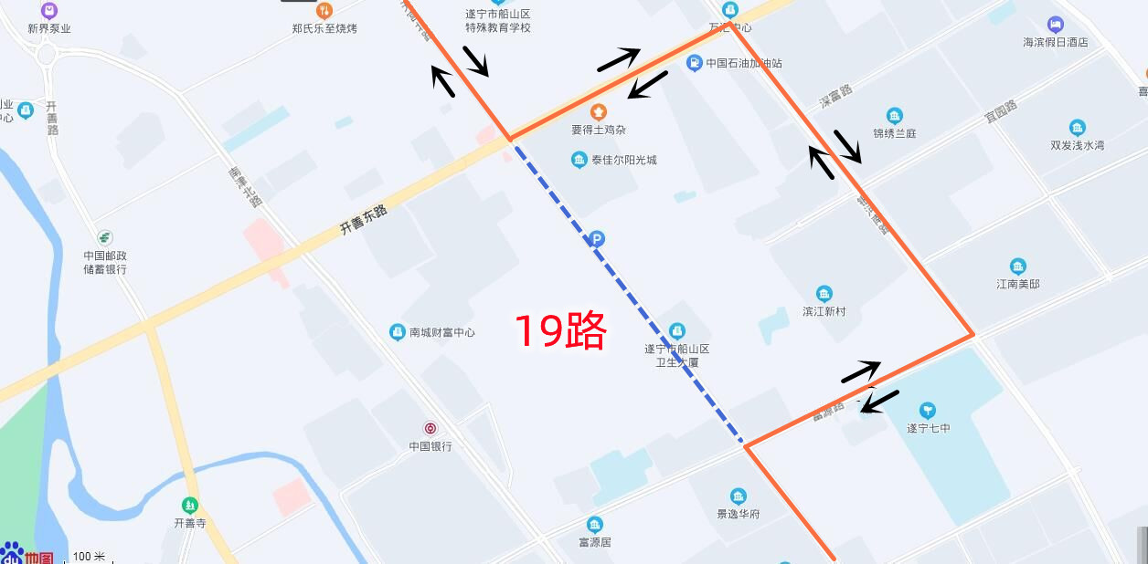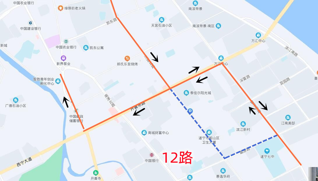 回程:金桥新区(仁湖花园)→金桥大道北段→涪江五桥西(龙凤古镇)→龙坪小学→机场南路中段→欧美产业园→清静寺小区→机场中路口→川师附校→金涪小区→世纪春天→银河南路南段(遂宁七中)→银河南路中段→南坝路口→南津桥→开善东路→开善路中段→南转盘