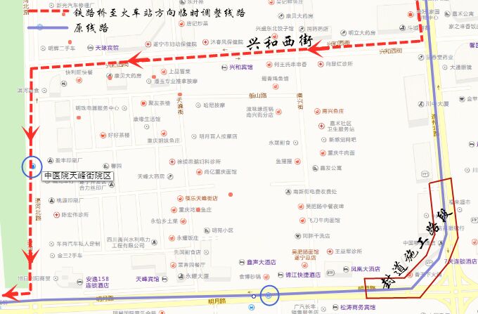 →市市场监管局→明月路岔路口→天友宾馆→王家湾→火车站商步街(驭祥驾校)→火车站