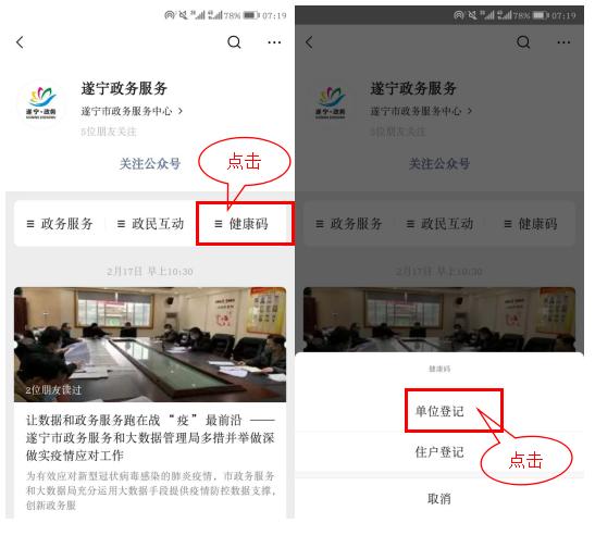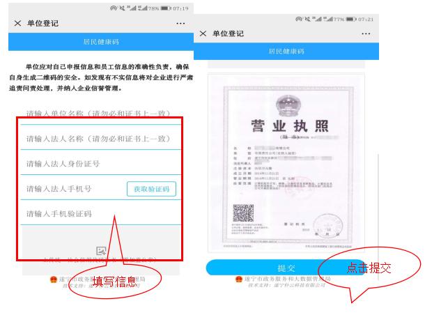 满足复工复产相关要求后,企业负责人在微信公众号中,搜索"遂宁政务服务",在公众号菜单健康码中点击企业登记,未允许复工开工的企业不得申报登记,在企业登记页面中仔细阅读责任说明,输入企业名称,法人名称,法人身份证号,法人手机号码,手机验证码,上传统一社会信用代码证书(需加盖公章),点击提交后,如图所示: