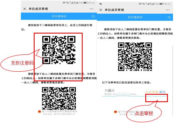 各个企业要负责本企业生成的专属二维码安全,登记提交成功后,收到企业专属的注册二维码和出入二维码,将注册二维码发放给全体员工扫码登记,对登记的员工逐一审核,如图所示: