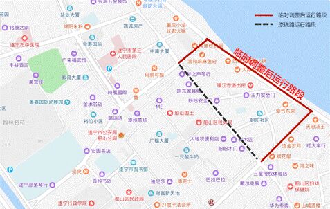 回程:川师大附属学校→金涪小区(招呼站)→圣平岛码头→世纪春天→遂宁七中→南坝路口→南津桥→南津北路→南小区→新市场→街市花园(滨江中路)盐市街口→和平路→城北粮站→介福桥→嘉禾桥(船山区政务服务中心)→兴和街口→蜀秀街口→北固街口→九莲街口→遂宁实验中学