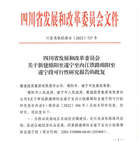 12月26日,绵阳至遂宁至内江铁路绵遂段可行性研究报告正式获得省发展改革委批复,该项目立项顺利完成!