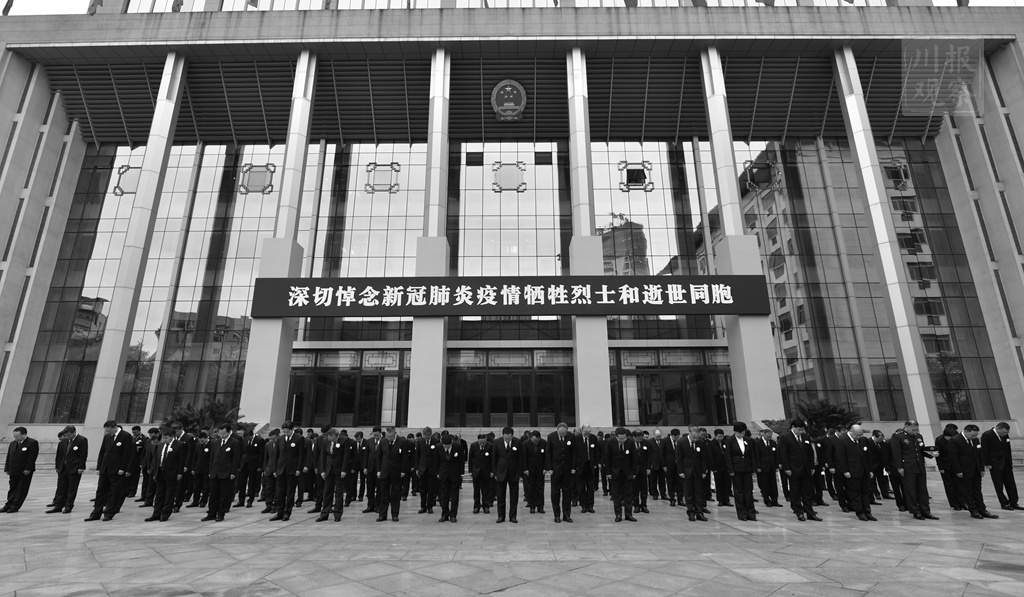 9时58分,彭清华、尹力、柯尊平、邓小刚等省领导与各界群众代表,胸前佩戴白花,神情凝重,默然肃立。10时整,防空警报声、汽车鸣笛声响彻城市上空,大家在肃穆的气氛中向新冠肺炎疫情牺牲烈士和逝世同胞默哀3分钟。